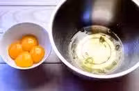 4.蛋白用中速開始攪打,短時間內即會出現粗泡,這時第一次加入細砂糖繼續打發;