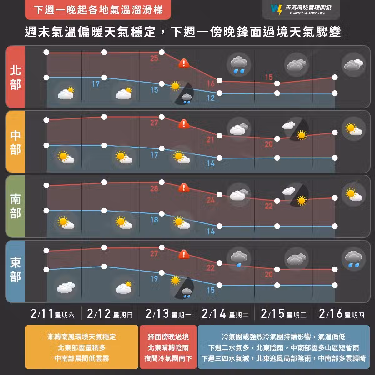 禮拜一下半天就要開始變天了,大家大外套別急著收!情人節外出慶祝也要注意保暖啊~