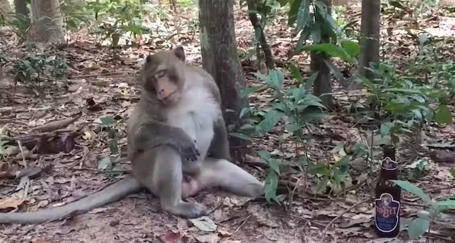 猴子一口氣「將整瓶酒喝光」,接下來請憋住別笑,「鏡頭記錄」爆笑一幕