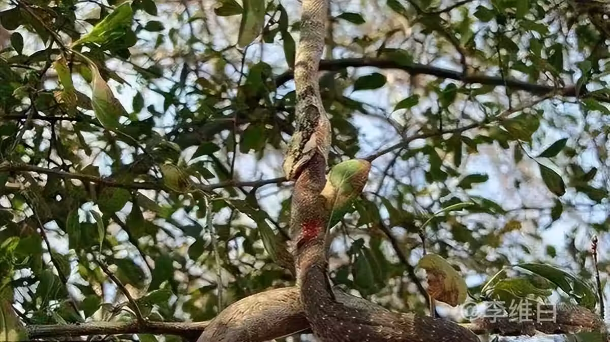在尚比亞西河下游公園內,一棵大樹上有一條非洲藤蛇正在吃另一條非洲樹蛇,一條大約20cm的藤蛇已經屯了樹蛇大約12cm,僵持了兩個小時後藤蛇還是放棄繼續吞食,而樹蛇的頭部已經血跡斑斑,想必生存不易了。