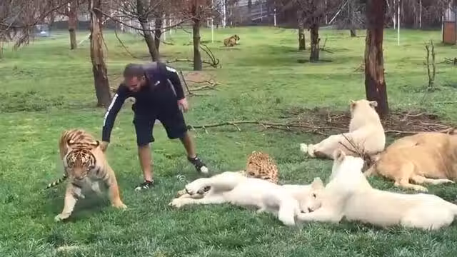 其實這只豹子並沒有真的想撕咬飼養員。因為這個飼養員平時和這些動物相處的非常好。