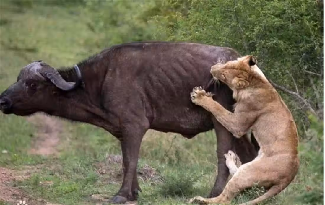 01母獅像疾風一樣撲向野牛,直接跳到野牛後背上,野牛試圖甩掉身上的母獅