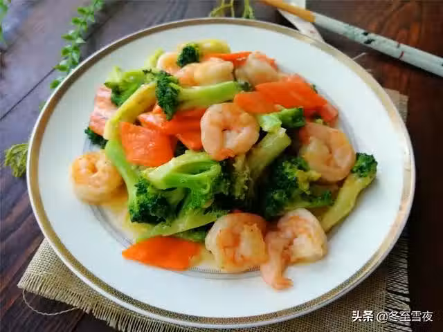 【西蘭花炒蝦仁】所需材料:冷凍蝦仁200克、西蘭花1/2棵、胡蘿蔔1段、油鹽適量、大蒜2瓣、料酒1/2湯匙、白鬍椒粉1/2茶匙、澱粉1/3茶匙、雞精1/2茶匙、