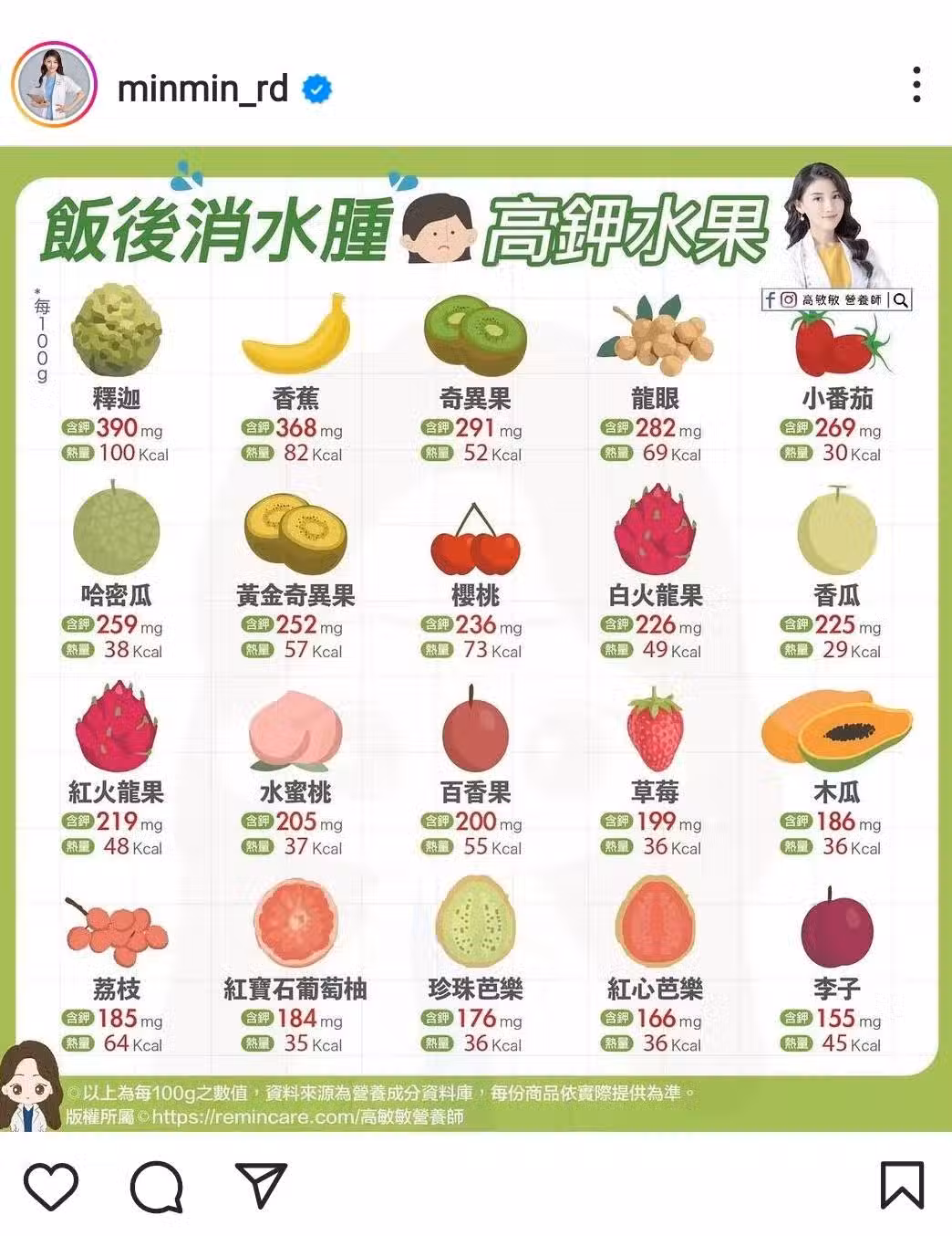 高敏敏說:「有些水果除了鉀含量豐富,營養成分更是一級棒!像是奇異果除了鉀之外也富含維生素C及奇異果酵素,幫助消化;香蕉高鉀之外,還有豐富的膳食纖維和果膠,能幫助腸胃蠕動順暢;哈密瓜可以代謝身體多餘水分。」