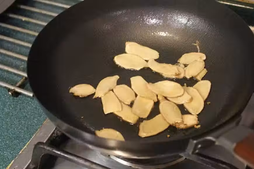 Step6.再放入黑麻油4大匙爆香。黑麻油不耐高溫,所以先用白麻油煸薑,以免產生苦味。