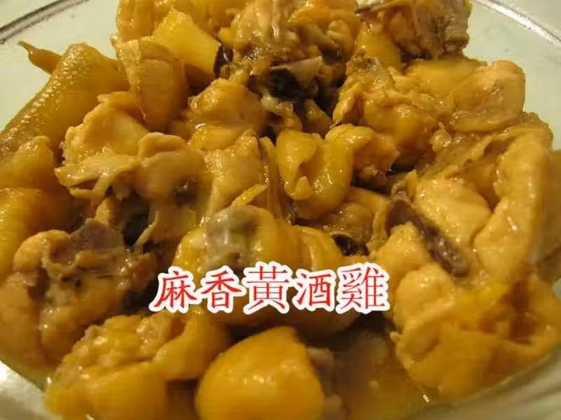 材料:雞1隻、黃酒一碗、麻油1湯匙、薑塊一大舊醃料: 鹽1茶匙、老抽半湯匙、生粉半茶匙和胡椒粉少許做法: 1將雞斬件後,用醃料醃30分鐘;2 燒熱深底鍋, 3 加麻油爆香薑片,落雞炒至半熟,將1碗黃酒加入雞內煮熱, 4用小火焗雞15分鐘便成