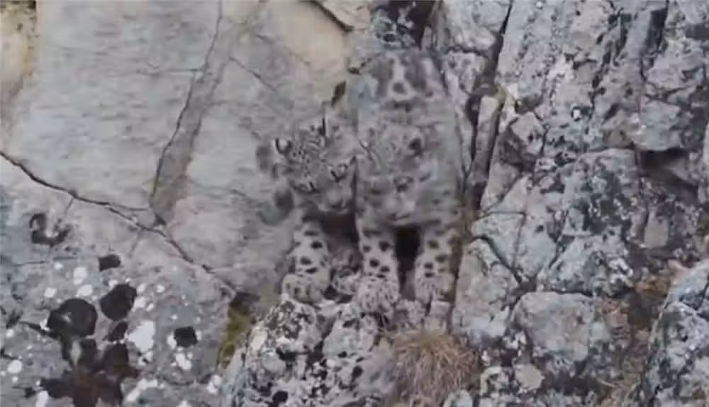 有了好吃的,兩隻幼崽都興奮地圍著母親轉,母雪豹將獵物的皮撕扯開,幫助幼崽進食。當兩隻幼崽愉快地吃著時,母雪豹卻在一旁警戒,銳利的目光掃過四周,時刻警惕著。