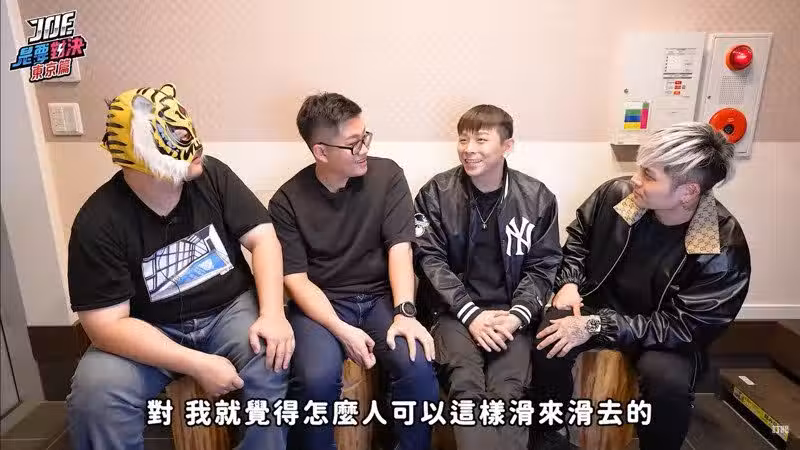 Joeman(左二)邀中指通(左起)、Nick、晨灰分享體驗泡泡浴的心得。(翻攝自Joeman YouTube頻道)