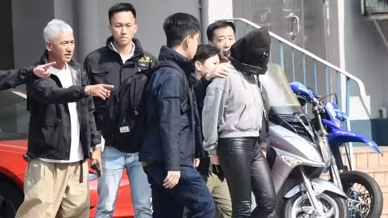 周二中午12時45分,載有女疑犯的警方私家車到達天水圍警署,逗留至下午3時20分,身穿皮褲、腳踏名牌CHANEL短靴的女疑犯,黑布蒙頭,由探員押離警署,預料返回西九龍總區刑事部續查。