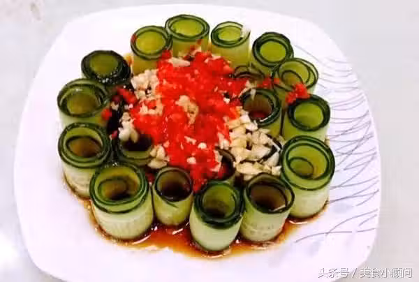 6.將黃瓜卷擺盤中,上面放點蒜碎、辣椒圈