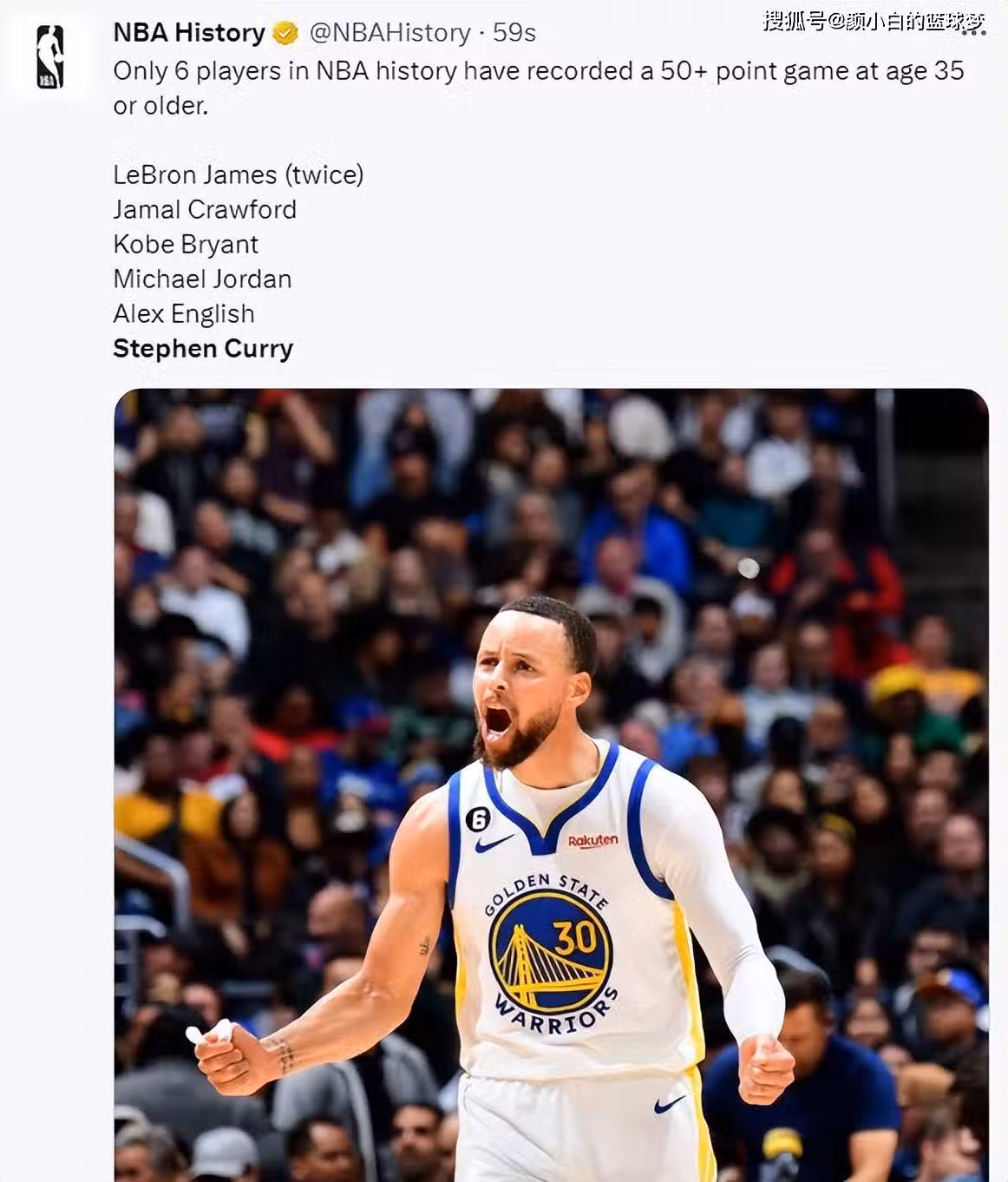 根據記錄,庫里也是歷史第六位超過35歲還拿下50+的球員,次數的話是第七次,因為詹姆斯35歲後兩次50+。