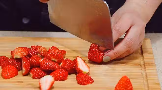 1、 草莓先將它去蒂,洗凈,豎著對半切開會更好看。