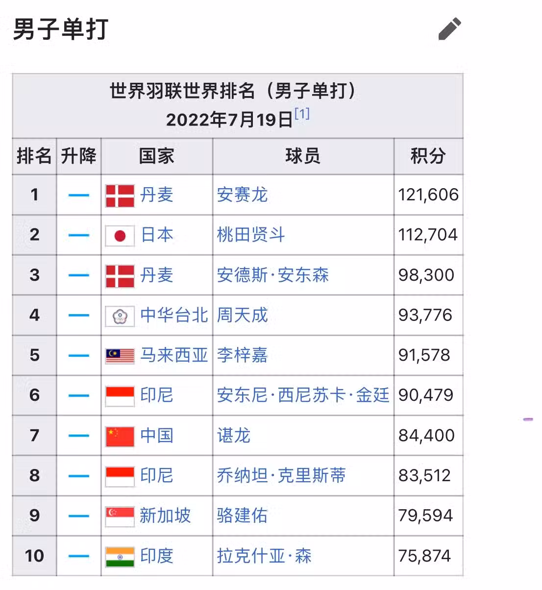 據不完全的統計顯示,自有國際羽聯組織下的世界排名積分以來。男單積分的紀錄分別由以下球員創造,李宗偉在2014年突破10萬分大關。
