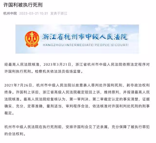 經最高人民法院核准,2023年3月21日,浙江省杭州市中級人民法院依照法定程序對許國利執行死刑。