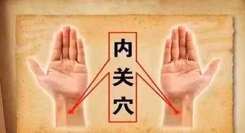 先用右手拇食指岔開,右拇指按壓左腕內關(在腕橫紋正中上2寸),右食指按壓左腕背外關(在腕背橫紋上2寸,尺骨與橈骨之間)。