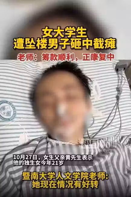 遭跳樓男子砸中!21歲女大生「下半身癱瘓」崩潰:只是逛個街 父親淚喊「根本無力負擔」:救救我女兒