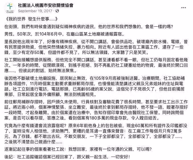 原來6年前,他因為包包被偷,現金60萬和所有證件都不見了,從此身無分文,最終在嚴重打擊下,才會突然什麼都不記得。如今他毫不容易終於碰到好心人,想起來後也激動地說:「我想回家,家裡還有爸爸,可以嗎?」這段故事讓不少網友感動地說:「人生空白了多久,才遇到好人!」、「謝謝社工沒有放棄他,相信他的話。」而男子目前已經送回東部住處,和家人團圓了。