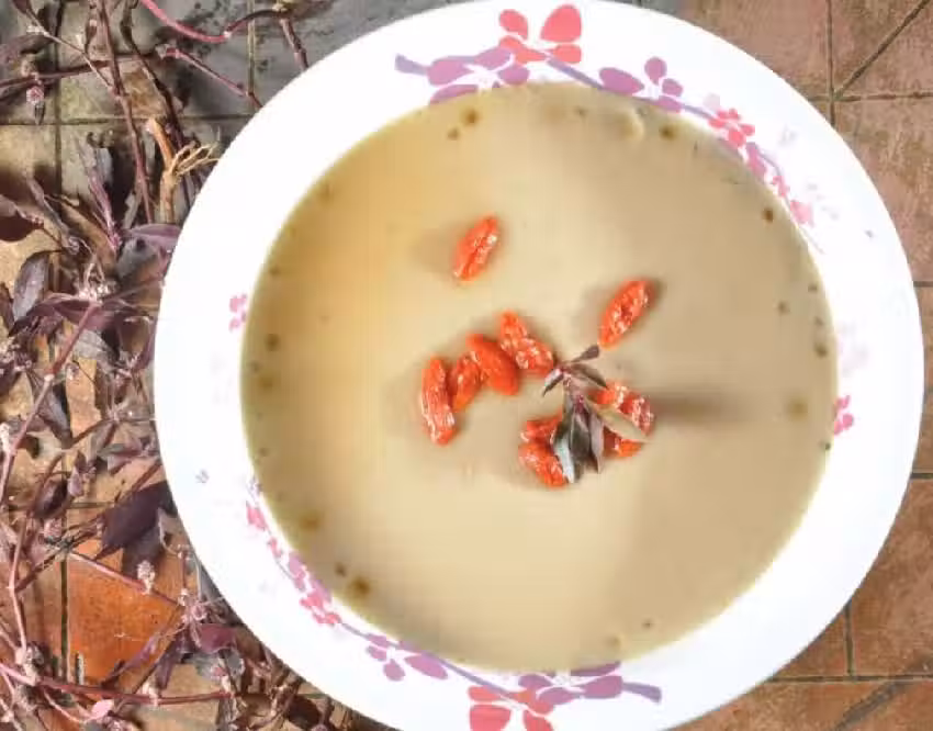 材料:紅田烏葉50克、雞蛋2粒、鹽、胡椒粉、麻油、杞子(洗淨)各少許。