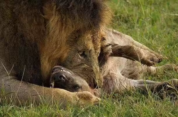 雄獅鎖喉鬣狗一招制敵,把鬣狗翻來覆去調戲,怕他裝死臨走再來一口