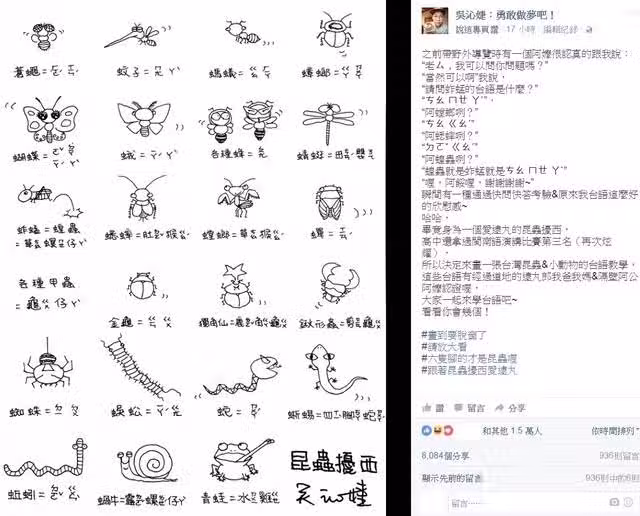 畢業於台大昆蟲系的「吳沁婕」是個小有名氣的昆蟲老師,他在個人粉絲團發了一張手繪台語教學表,不但詳細畫出昆蟲的外型,還用注音拼出唸法,像是蜘蛛就是ㄉ一ㄉㄨ,蟋蟀就是ㄉㄡˇㄍㄠˊ,這麼用心的插圖立刻就被8千人瘋狂轉發,超過1萬5千人按讚!