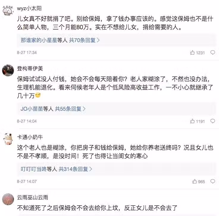 這篇新聞曝光後,立刻就引起了網友們熱議,紛紛留言說「彷彿看到了老父親臨終前的難過與絕望」、「錢是老伯伯的,自然他有權決定留給誰」、「不孝加不肖的子女真多,這位老先生做得好!」不過也有人不太認同,表示「老人太絕情,父女50年親情,難道比不上保母三個月的照顧」、「女兒也許關心太少,但女兒可能有女兒的苦衷,而且看護也是她出錢請來照顧老人的啊」、「也許女兒本身就生活、工作兩頭燒了,實在抽不出時間也是沒辦法的。」