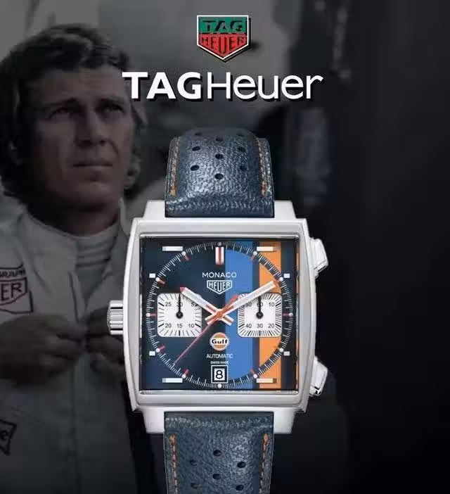 其中的摩納哥系列,是很少見的方形計時碼表,因為賽車電影《勒芒》知名度很高,也是最經典的方形腕錶之一。