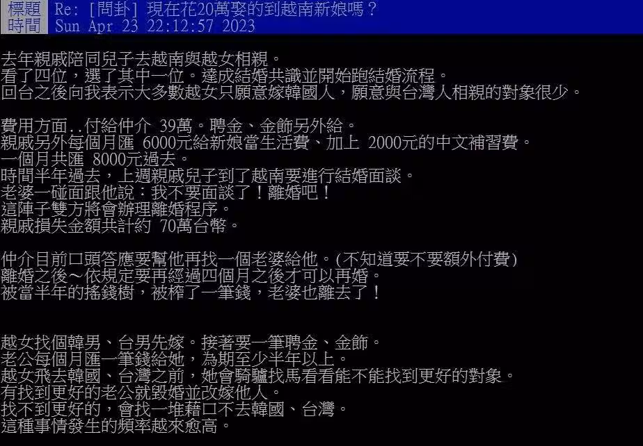 對此,網友們相當同情並留言:「他們都有論壇或群組在教怎麼騙,感覺比台女還要現實。」、「台灣人的錢真好騙。」、「以前是生完才跑,現在更早...」、「倒不如將錢拿去東南亞尋歡作樂。」、「毀約不用付違約金嗎? 說不嫁就不嫁的...」、「認真談感情都會跑了,花錢買的本來就沒保障啊。」