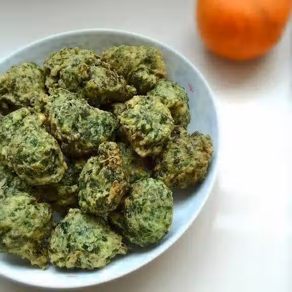 3.鍋中熱油,有6成熱左右,用勺子舀成丸子,下入鍋中。如果喜歡特別圓的,也可以用手搓圓,更漂亮。
