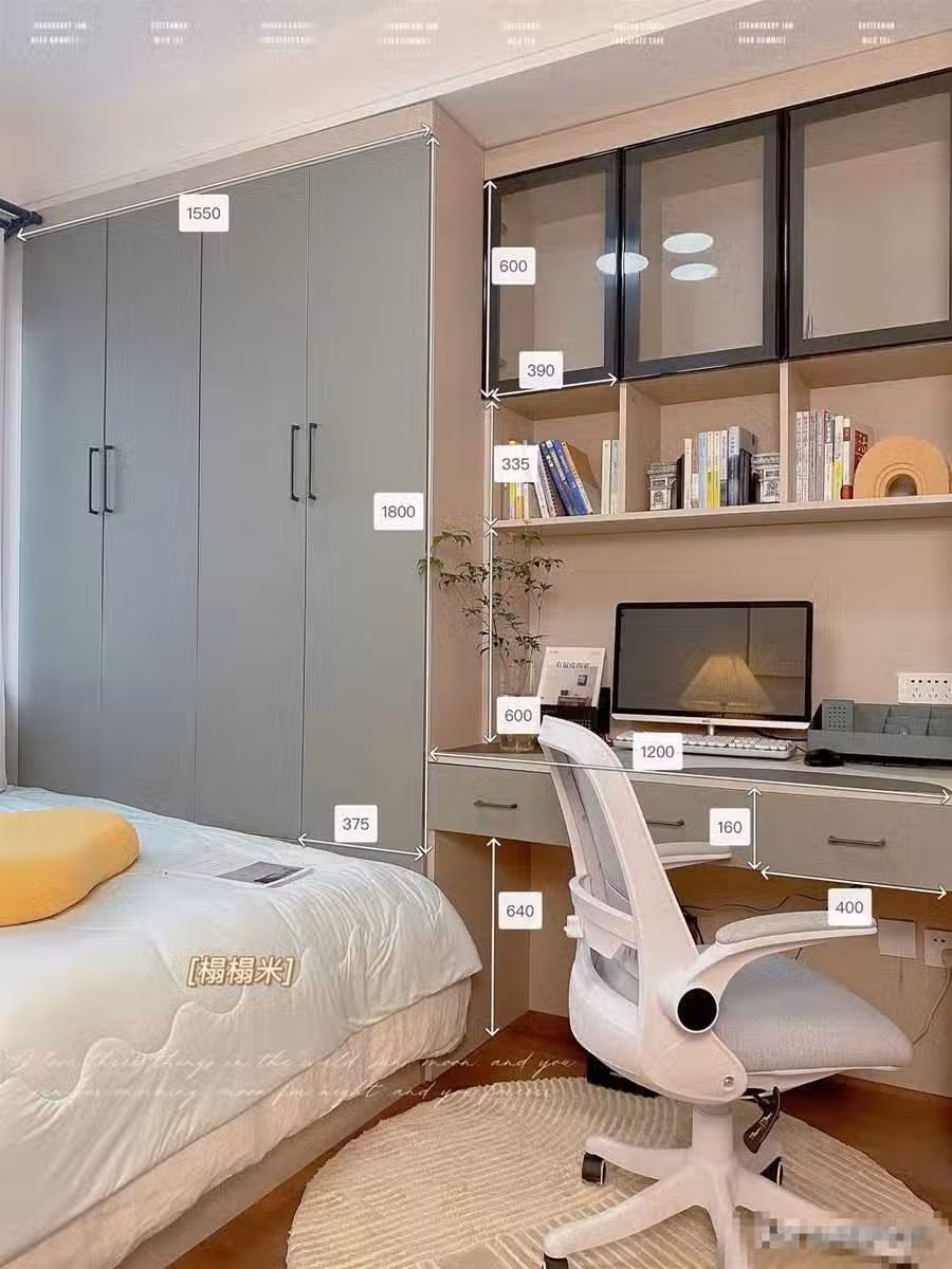兒童房定製了連同衣櫃採用一體化設計的榻榻米地台床,這樣不僅功能強大,而且還能釋放右側的空間,再設置緊挨在一起的書櫃和書桌,不過由於現在孩子還小,目前就作為男主的書房使用。
