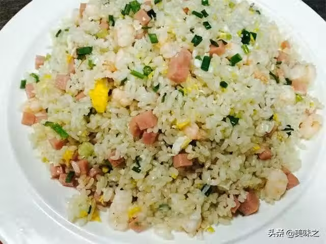 火腿適量、白米飯適量、雞蛋適量、蝦仁適量、蔥花適量、鹽適量、味精適量、雞精適量、白鬍椒粉適量、麻油適量。