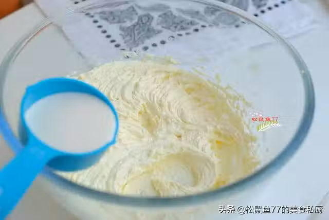 5、牛奶要分次加入,邊打邊倒,每次混合均勻後再加入下一次的牛奶。不要一次加太多,容易出現水油分離,我大概是分了五六次。打發好的黃油顏色變白,體積膨大了數倍,看起來又白又輕盈,如圖中的樣子,這樣的黃油就打發完成了。