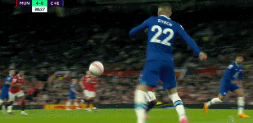 第89分鐘,切爾西打出反擊,齊耶赫在後場右路送出傳球,菲利克斯在中圈接球長驅直入,帶球來到禁區前右腳低射,德赫亞撲救不及,切爾西1-4落後曼聯。