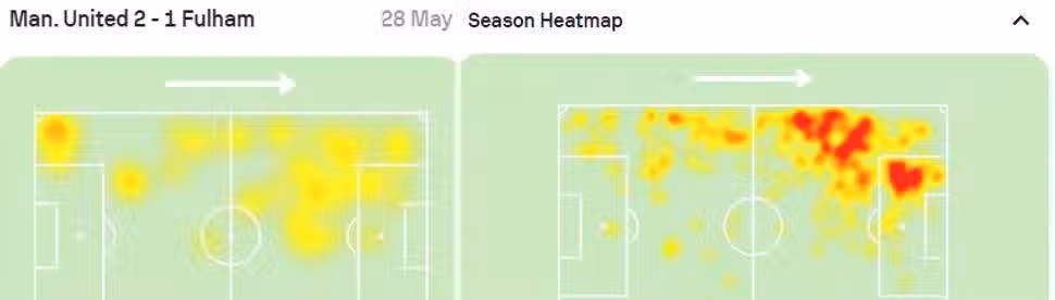 首先我們對比一下加納喬2:1戰勝富勒姆的比賽,加納喬的活動熱點和賽季平均活動熱點。很明顯,加納喬的活動區域更靠近中路,而不是擴大邊路的寬度來進攻,中路禁區前沿的接觸點非常接近。很顯然,本場比賽加納喬的主要任務是在前腰位置上提供掩護,承擔一定的逼搶責任。他在這場比賽中完成了1次攔截和2次搶斷。