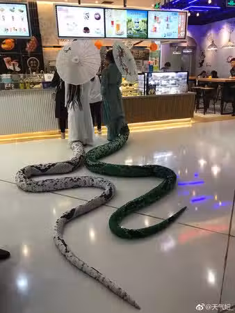 根據《ETtoday新聞雲》報導,網路上瘋傳一張照片,只見兩個正妹突發奇想,穿著一白一綠的古裝,撐著紙傘參加《白蛇:緣起》的活動,買飲料拖著巨大尾巴的畫面被路人拍下,只見她們一邊走尾巴還會一直蠕動,讓不少小朋友都好奇的伸手去抓。