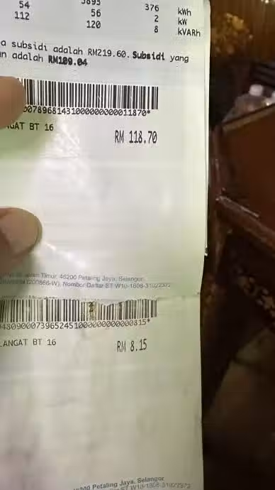 (八打靈再也6日訊)一名自稱住在甘榜木屋的住戶在網上申訴,家裡沒有冷氣機、電視機、Wifi,可是這個月的電費暴漲幅度離譜,從上個月的8令吉15仙漲至118令吉70仙,好嚇人!