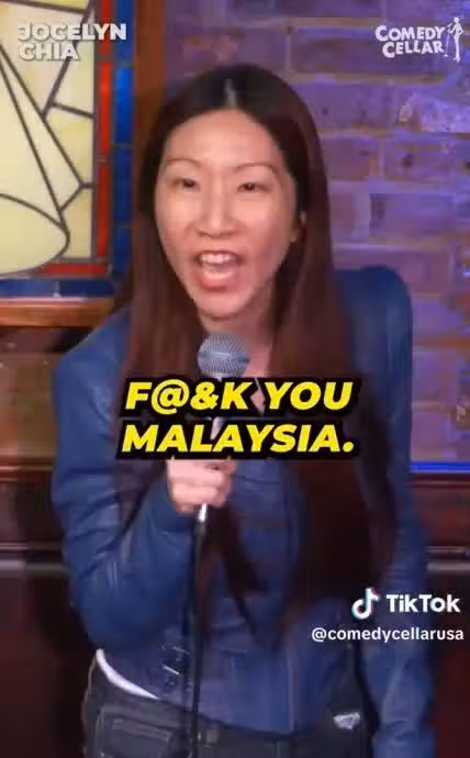 Jocelyn Chia在台上直接大罵「F–k you, Malaysia」 ,言語中似乎對馬來西亞很不滿意。(取自TikTok/comedycellarusa)