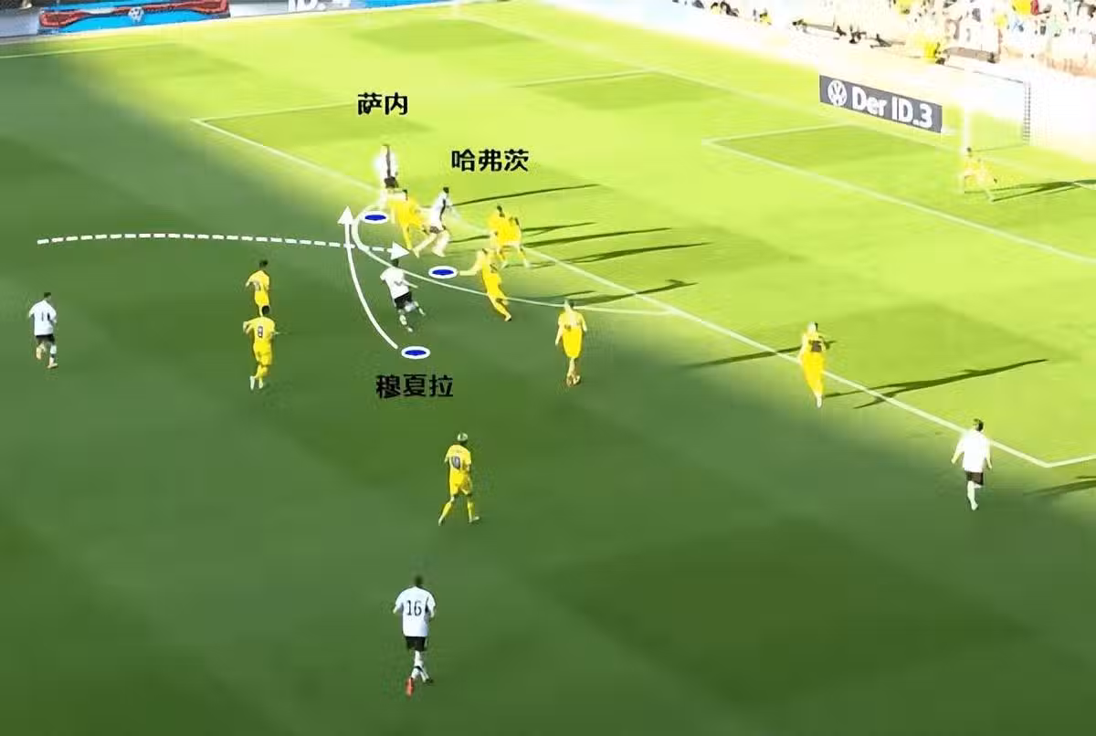 從鏡頭上可以看得很清楚,哈弗茨完成一波掩護跑,中路拿球的穆夏拉就能給側翼空位的薩內送出傳球。