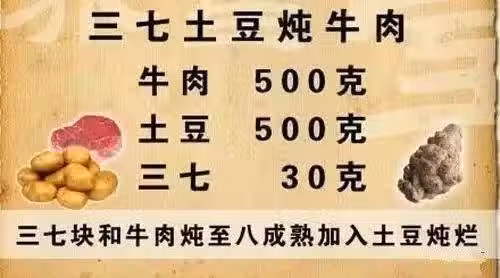 三七土豆燉牛肉具有補脾、活血益氣、抗衰老、降血壓、保護心臟等功效,經常食用還可以預防中風。