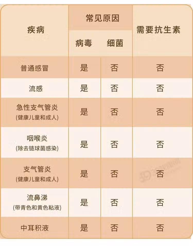 事實上,90%的感冒是由病毒引起的上呼吸道感染綜合征, 不需要服用抗生素類藥物。只有患者明確合併細菌感染(細菌性感冒),考慮有肺炎、鼻竇炎或中耳炎時,才應加用阿莫西林或頭孢等抗生素治療。