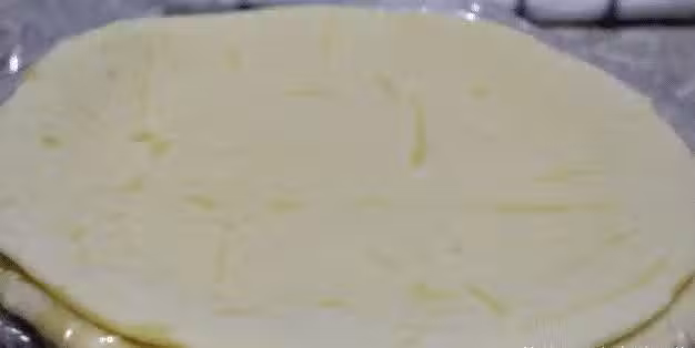 然後把面片從頭一點一點的疊起來,面片疊成長條狀之後用手揪住兩頭稍微拉長一點,再從一頭慢慢捲起來,再用擀麵杖擀薄之後,我們的手抓餅形狀就出來了。這個手抓餅就是我們超市裡買的是一樣的,放在冰箱裡面隨吃隨取,十分方便。