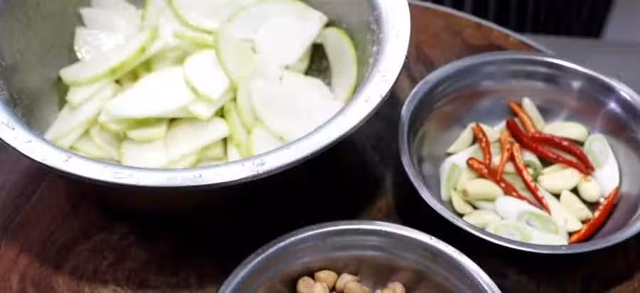 3.把蘿卜腌好後擠干水分,放入另一個盆中備用,在裝姜蒜的小盆中,加入味極鮮20克,生抽15克,陳醋25克,白糖20克,老抽3克上底色,用勺子攪拌化開。