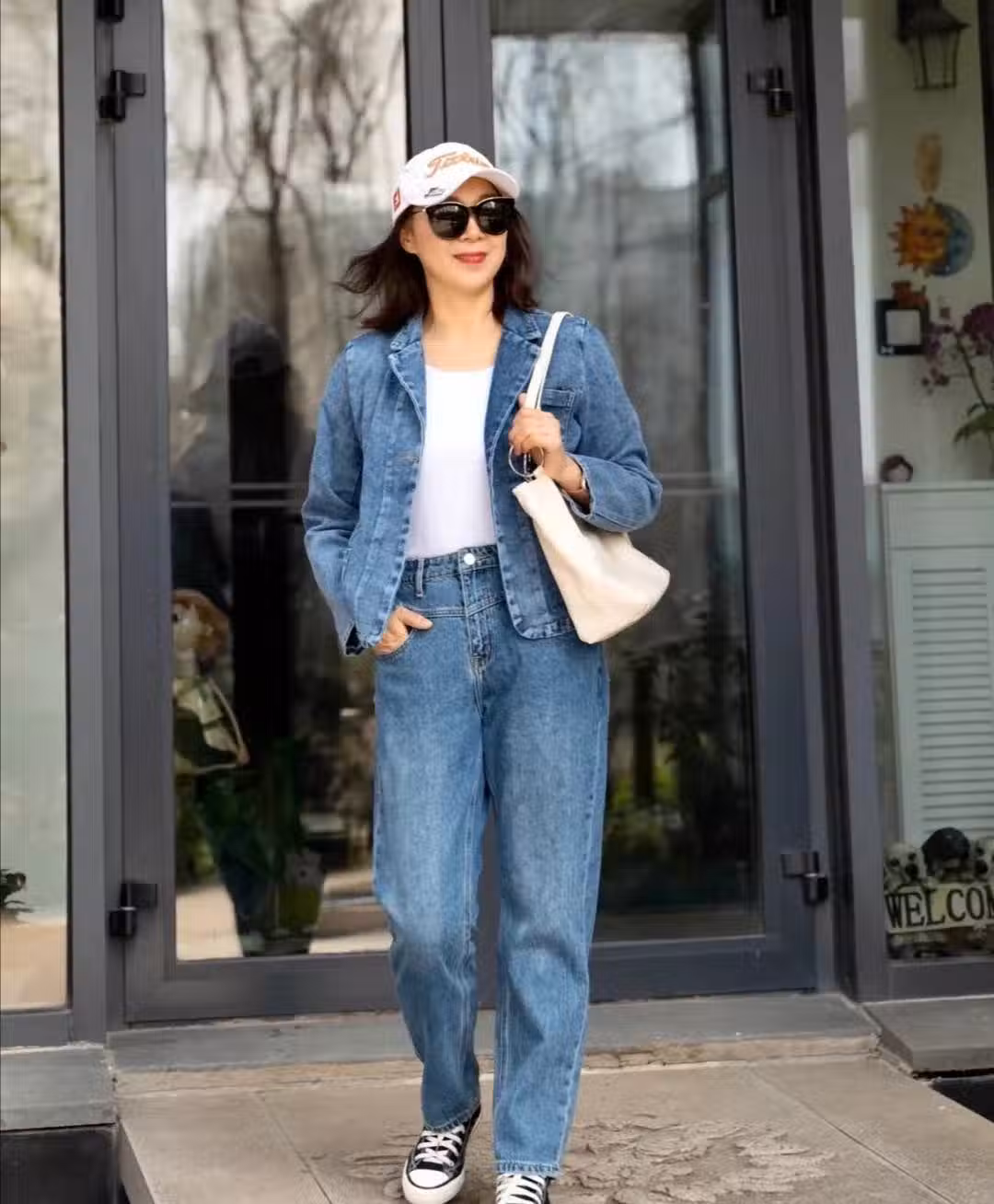 選用的牛仔外套不需要特別的窄小,稍微寬松一些,穿起來更舒服,看起來也更加大方自然。下半身結合的牛仔褲也是如此,不要一味地使用緊繃的褲裝,輪廓寬一點更顯瘦。顏色之間保持一致,運用藍色構造清新感。