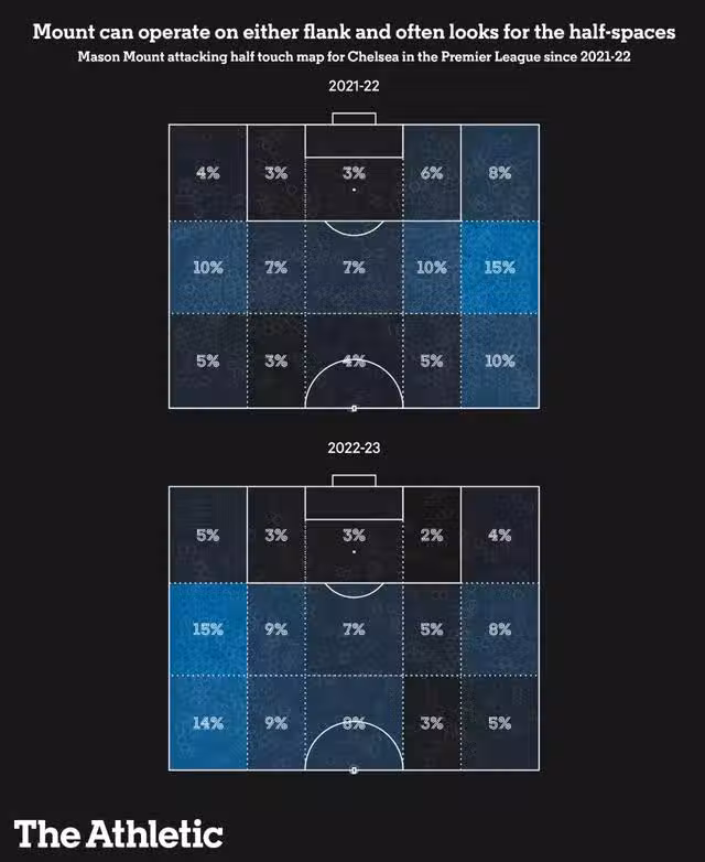 在這方面,芒特的技術能力和雙腳均衡屬性,讓他可以擺脫對手的高壓,保持球的移動。他不受傳球角度的限制,能夠以相對準確的傳球在左右兩側傳控,同時在面對本方球門時保持更短更安全的傳送。