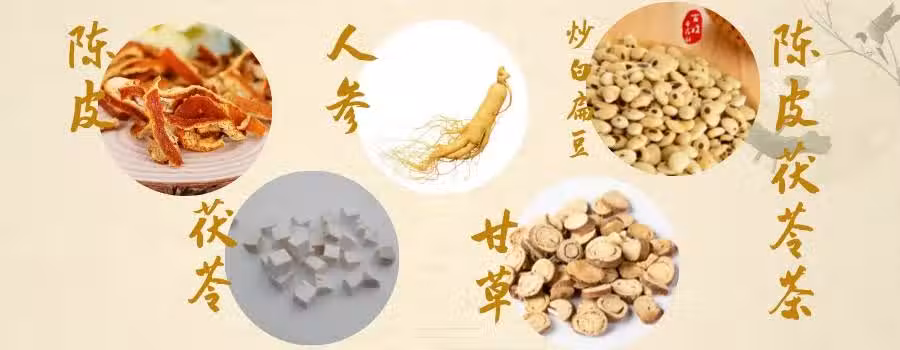 陳皮理氣健脾、調中燥濕;茯苓、炒白扁豆健脾除濕;甘草補脾益氣,清熱解毒;人參,健脾益氣。