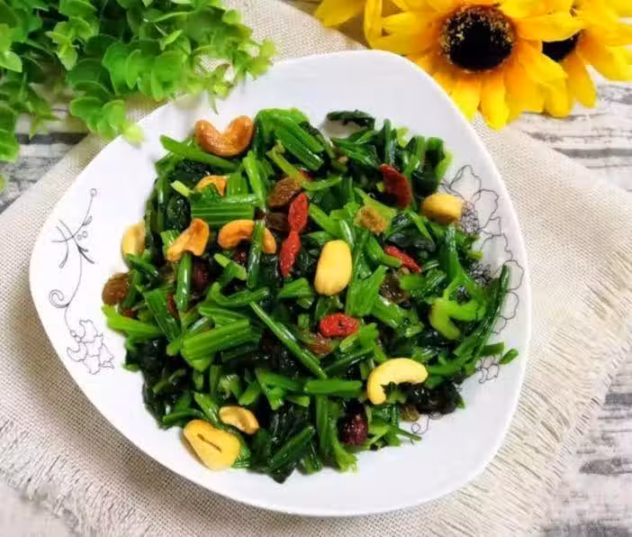 所需食材:菠菜、蒜、醋、糖、鹽、香油等,以及一小把自己喜歡吃的堅果。