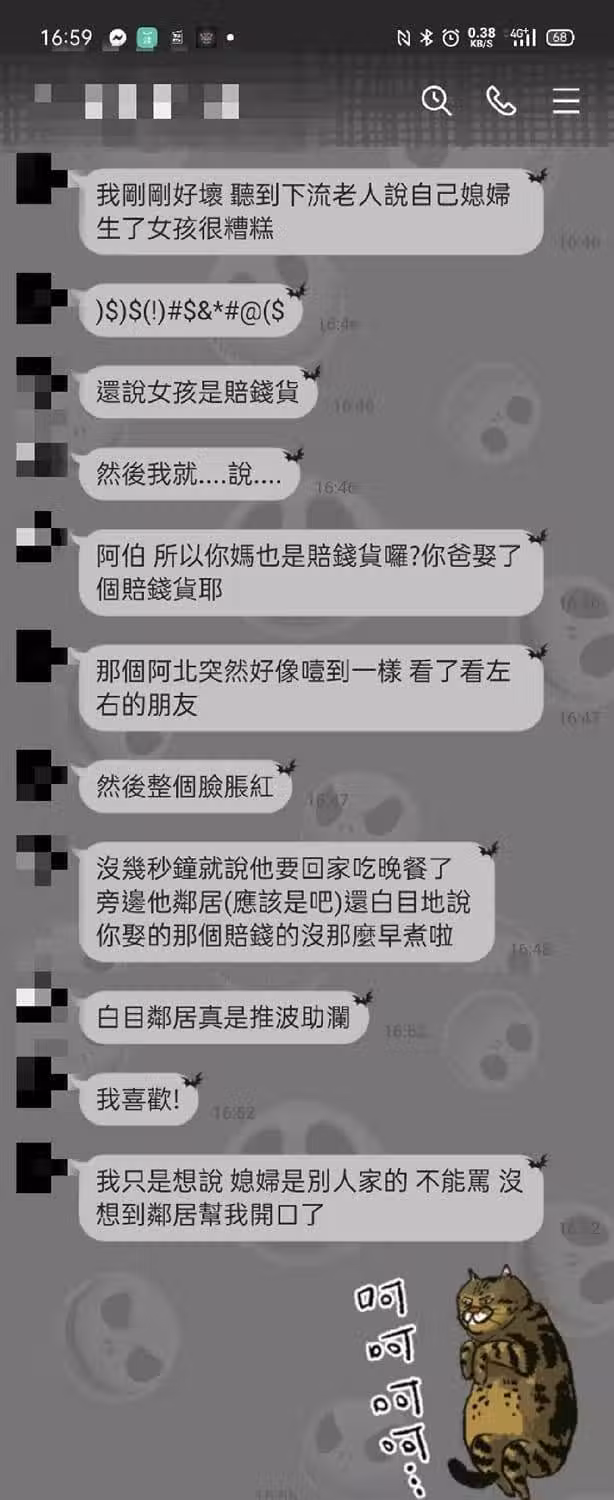 根據ETtoday報導,最近有位女網友在臉書「爆廢公社二館」分享一張對話截圖表示,當時老妹聽到一位老伯抱怨自己的媳婦生女孩很糟糕,甚至還把「賠錢貨」三個子掛在嘴邊,使得身為女人的她瞬間氣炸,並瞬間機智開嗆:「阿伯...所以你媽也是賠錢貨囉?你爸娶了個賠錢貨耶。」