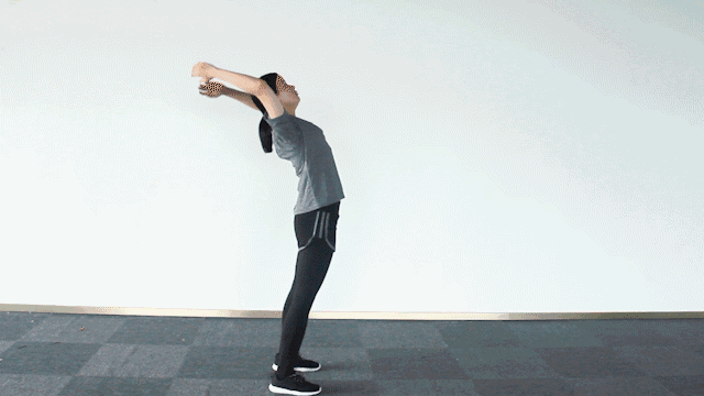 練習時需站立,肩松,兩手臂下垂伸直於體側,雙手臂前伸上抬,甩至頭頂上方,同時配合挺胸仰頭,再將雙臂返回前甩至下後方,同時配合伸腰低頭活動,如此連續甩手7~14次。