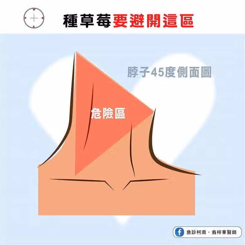 翁梓華醫師提醒,頸部左右各有一條頸動脈,包括總頸動脈、椎動脈,總頸動脈向上再分流成內頸動脈、外頸動脈2條,形成「頸前三角區」。因為頸動脈為頭部供氧的主要血管,對於年紀稍長者要注意施力,若不當施力造成血管受傷,甚至可能會造成血管剝離等急性心血管風險,所以這個三角區位置要盡量避開。
