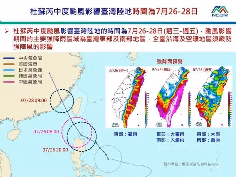 劉宇其指出,26、27日颱風影響最明顯,風雨由東半部往南部加劇。26日颱風約在台灣南方,東半部、恆春半島會有明顯降雨、甚至局部豪雨發生的機會,西半部也有短暫陣雨;27日颱風影響最大,東半部降雨持續,中南部、尤其是南部降雨明顯,台東可能會有大豪雨;28日風雨才會逐漸減弱,但水氣多,南部降雨仍明顯。