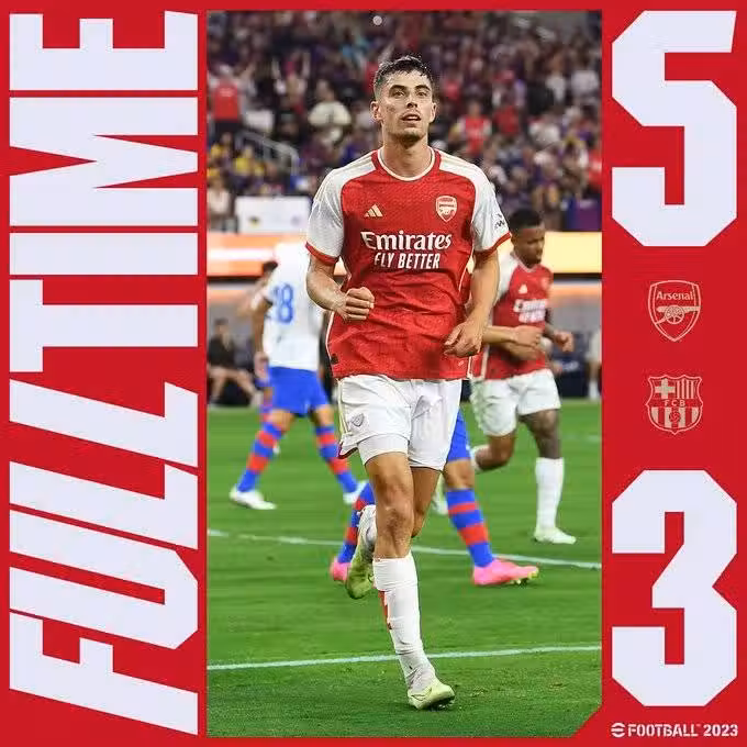 北京時間7月27日11時06分,正在美國行的阿森納與巴薩進行了一場熱身賽,第8分鐘,巴薩前鋒萊萬首開紀錄,第12分鐘,克里斯滕森失誤送禮,薩卡門前撿漏得手,第21分鐘,阿勞霍手球送點,但薩卡點射踢偏,第34分鐘,拉菲尼亞直接任意球破門,第43分鐘,哈弗茨搶點扳平比分,第55分鐘、第78分鐘,特羅薩德完成梅開二度,第88分鐘,費蘭替補搶點扳回一城,第89分鐘,法比奧-維埃拉遠射得手,最終阿森納在一場進球大戰中5-3擊敗巴薩。
